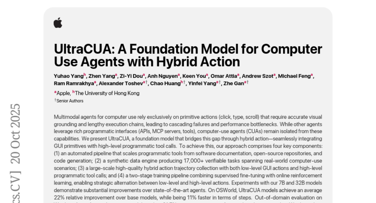 这项由苹果公司和香港大学联合开展的研究发表于2025年10月,论文编号为arXiv:2510.17790v1,有兴趣深入了解的读者可以通过该编号查询完整论文。研究团队由苹果公司的杨雨昊、杨振、窦梓艺等多位研究员以及香港大学的黄超教授等学者组成,他们共同开发了一个名为UltraCUA的突破性AI系统。